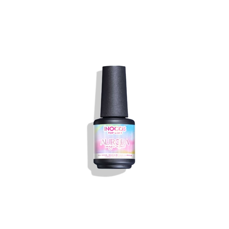 Apresentamos-te o Verniz Gel Top Coat Aurora Magic sem goma. Torna qualquer cor opaca numa cor cintilante, com o efeito mágico do Top Coat Aurora INOCOS.