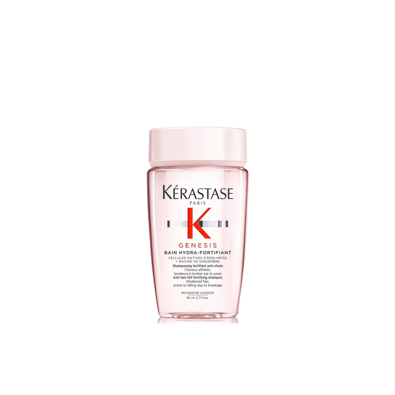 Champô antiqueda Kérastase Genesis Bain Hydra-Fortifiant 80ml para cabelo enfraquecido, com tendência a queda devido à quebra. Limpa suavemente e reforça a fibra capilar para reduzir o risco de queda de cabelo devido à quebra.  Esta formula ultra delicada é ideal para cabelo fino ou oleoso para remover o sebo e as partículas de poluição do couro cabeludo e da fibra capilar. A sua ação de limpeza suaviza e hidrata o cabelo desde a raiz até às pontas, deixando-o com um toque natural. Enriquecido com a potente combinação de Células Nativas de Eldelweiss e Raiz de Gengibre, esta fórmula fortifica a fibra e reduz o risco que queda devido à quebra. O cabelo fica preparado para ser tratado, fortificado e com uma aparência mais saudável.