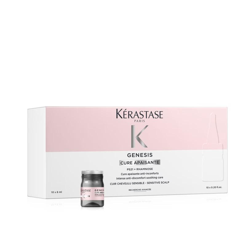 A Kérastase Genesis Cure Apaisante é uma cura intensiva que acalma e hidrata o couro cabeludo sensível ou irritado. Em apenas 10 dias, elimina a comichão e a vermelhidão, protegendo a pele e garantindo um conforto absoluto e duradouro.