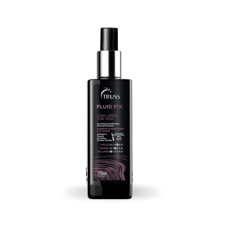 O TRUSS Fluid Fix 250ml é um spray leave-in que ajuda a definir e fixar caracóis/ondas com efeito duradouro, sendo altamente recomendado para usar com babyliss/modelador. Controla o frizz, dá volume na raiz, seca rápido e ajuda a manter o penteado por até 24 horas, com um acabamento mais brilhante e flexível.